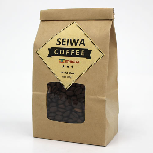 珈琲バルブ付きの無地のガゼット袋に、お手軽プリントで作成したラベルを貼っています。