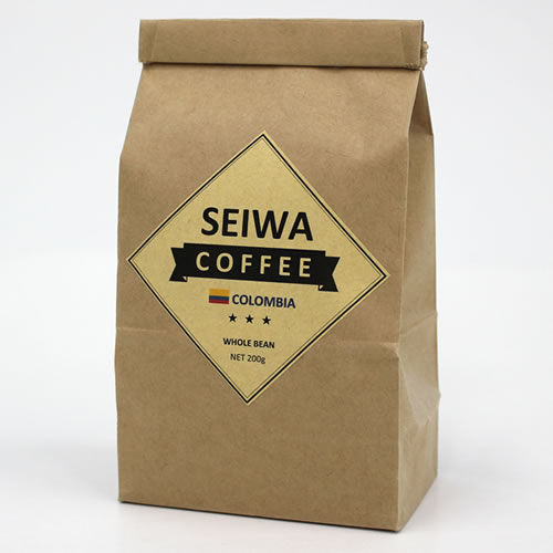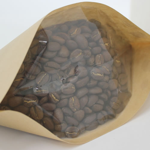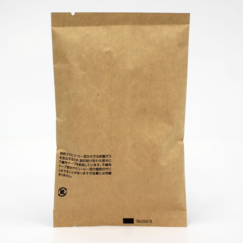 珈琲バルブ付きの無地のチャック付スタンド袋に、お手軽プリントで作成したラベルを貼っています。