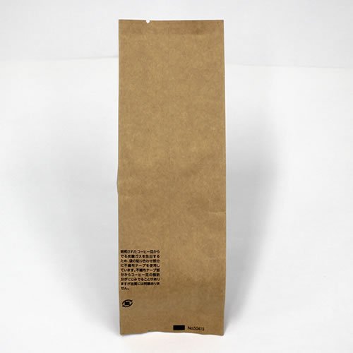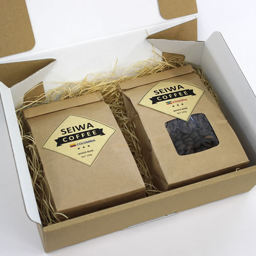 珈琲バルブ付きの無地のガゼット袋に、お手軽プリントで作成したラベルを貼っています。