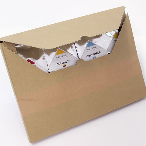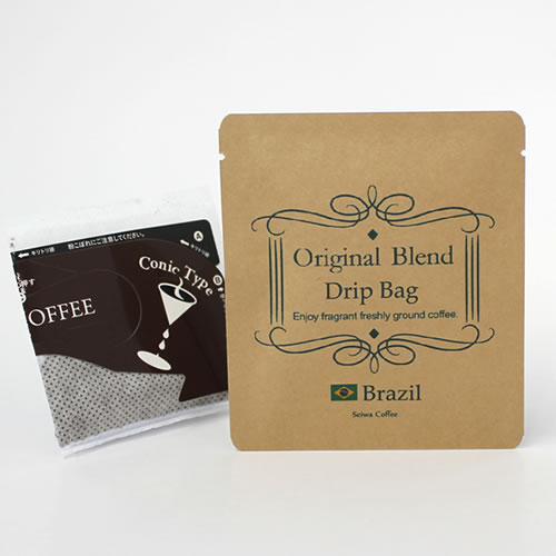 円錐型の珈琲用ドリップバッグを三方袋に入れています。クラフト素材の三方袋は、インクジェットプリンタでデザインを袋に直接印刷しています。